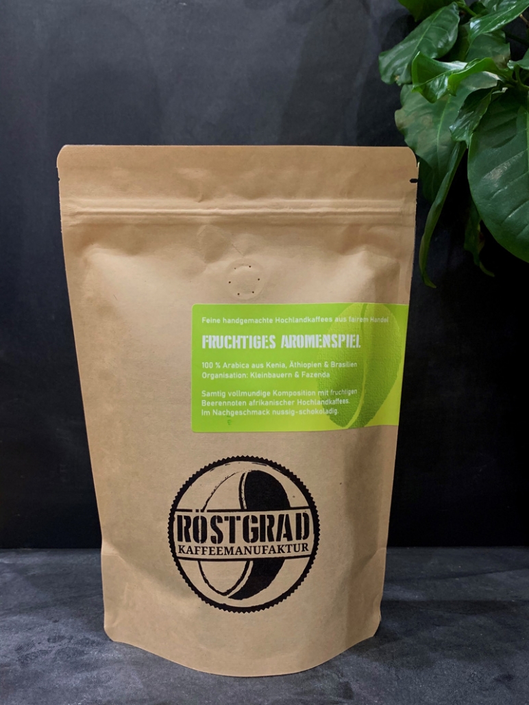 Ein samtiger Genusskaffee mit fruchtigen Noten afrikanischer Arabicas und gleichzeitiger nussiger Ausgewogenheit eines brasilianischen Facenda-Kaffees. Durchaus auch zum Obstkuchen interessant.